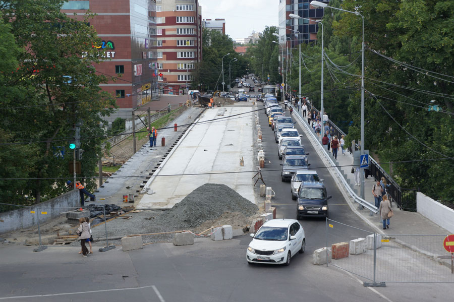 Напомним, ремонтные работы на мосту ведутся без полного перекрытия движения транспорта; в начале июня была отремонтирована левая сторона путепровода, и автомобили сейчас двигаются по ней.