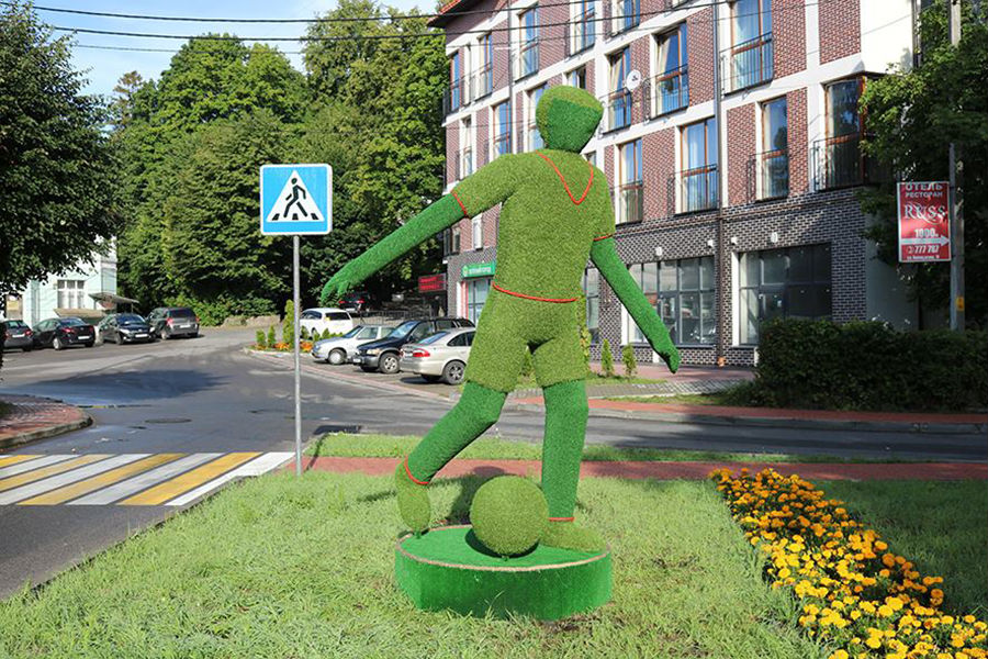 В Светлогорске на перекрестке Калининградского проспекта и ул. Балтийской недалеко от озера Тихого появилась топиарная скульптура «Футболист», сообщает