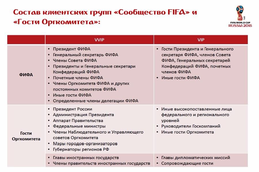 «Размещение клиентских групп также является важнейшей составляющей подготовки турнира. Всего клиентские группы FIFA будут размещаться в 40 тысячах номеров в более чем 400 гостиницах трёх, четырёх и пяти звёзд. 80 процентов номерного фонда уже законтрактовано.