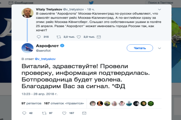 Компания «Аэрофлот» уволила бортпроводницу, которая назвала Калининград Кёнигсбергом. Об этом компания заявила в Twitter.