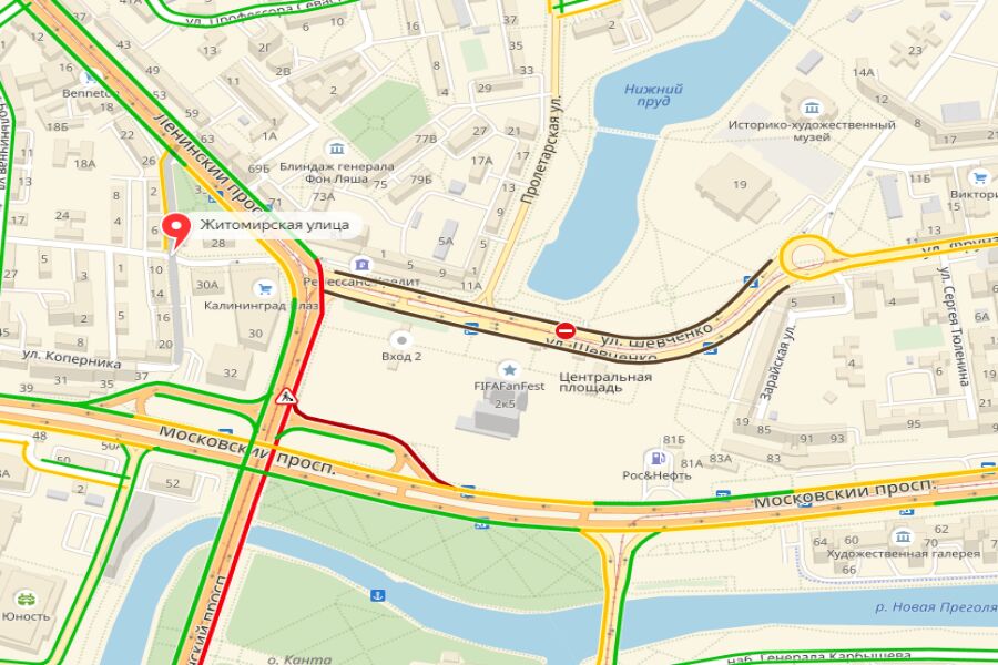 Напомним, ул. Шевченко на период работы фанзоны полностью закрыта для движения любого вида транспорта. Вход в фанзону будет осуществляться со стороны гостиницы «Калининград», выход — на ул. Шевченко. На Нижнем озере — по ул. Пролетарской будет организована велопарковка.