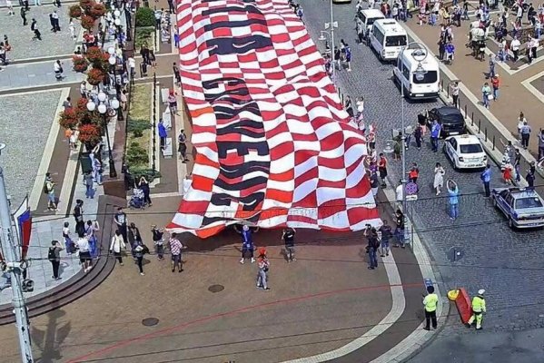 Болельщики сборной Хорватии по футболу развернули на площади Победы в Калининграде огромный флаг в национальных цветах (