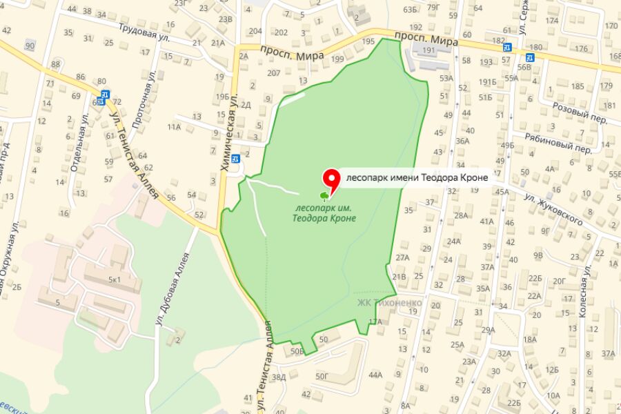 Парк расположен в конце проспекта Мира на перекрёстке Тенистой аллеи и ул. Химической.
