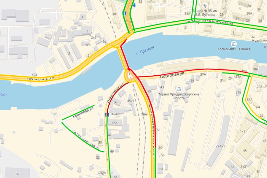 На двухъярусном мосту столкнулись два легковых авто, направлявшихся в сторону ул. Генерала Буткова. Участники аварии перекрыли движение, объехать их можно только по встречной. Согласно данным сервиса «Яндекс.Пробки», скорость движения по ул. Портовой не превышает 5 км/ч, по ул. Железнодорожной — 7 км/ч.