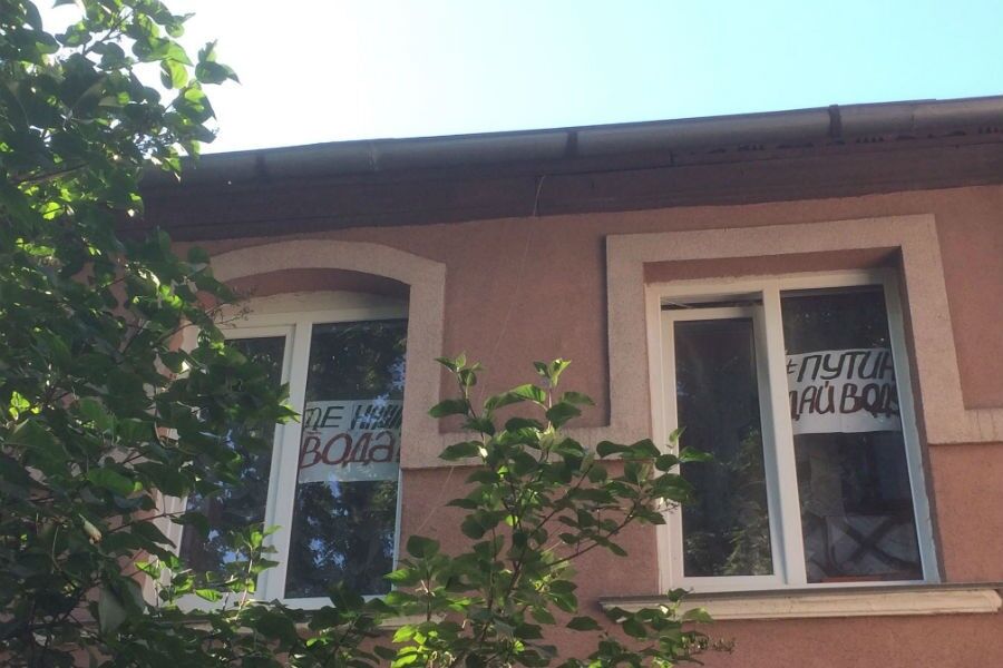 Картонный плакат вывесили в окне одного из домов в центре курортного города. В соседнем окне — табличка с вопросом «Где наша вода?».