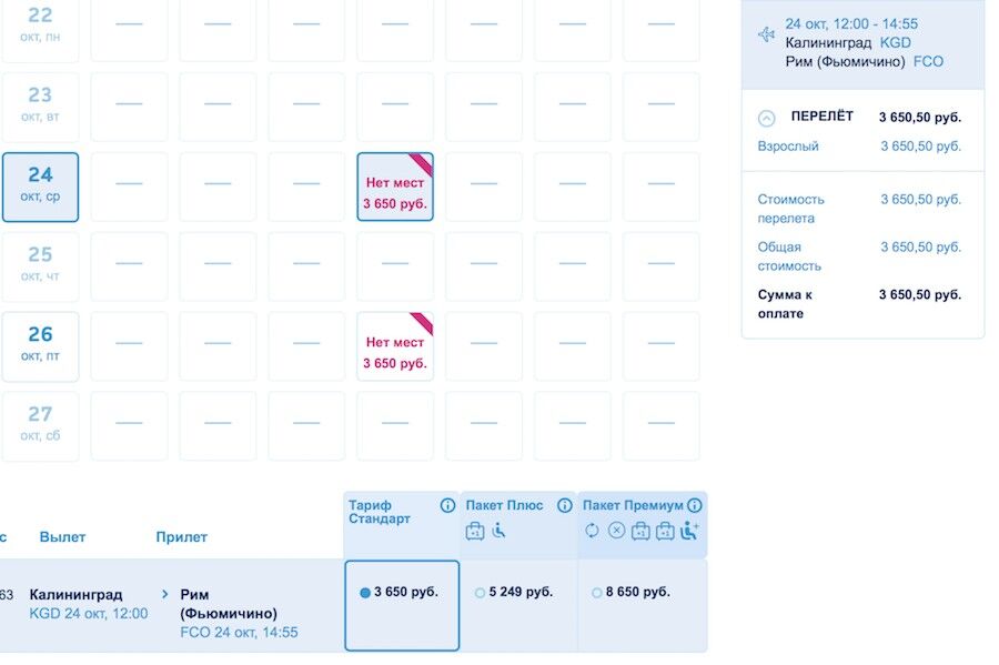 Минимальная стоимость билета без багажа в одну сторону из Калининграда в Рим составляет 3650 рублей, из Калининграда в Лондон — 2086 рублей. Продажа билетов