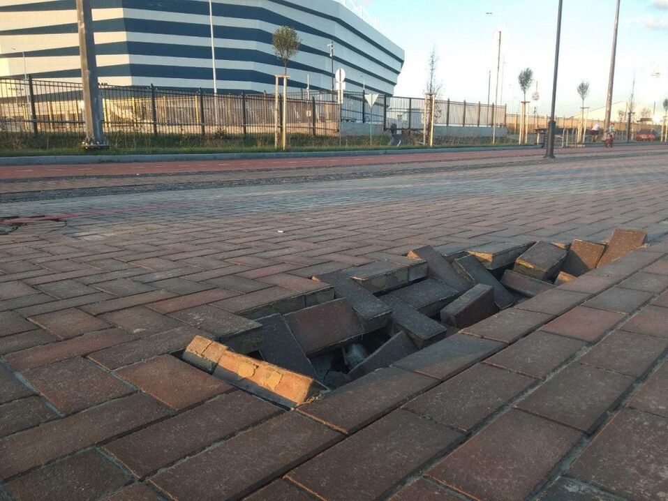 Новый провал плитки на Парадной набережной возле стадиона на Острове в Калининграде образовался