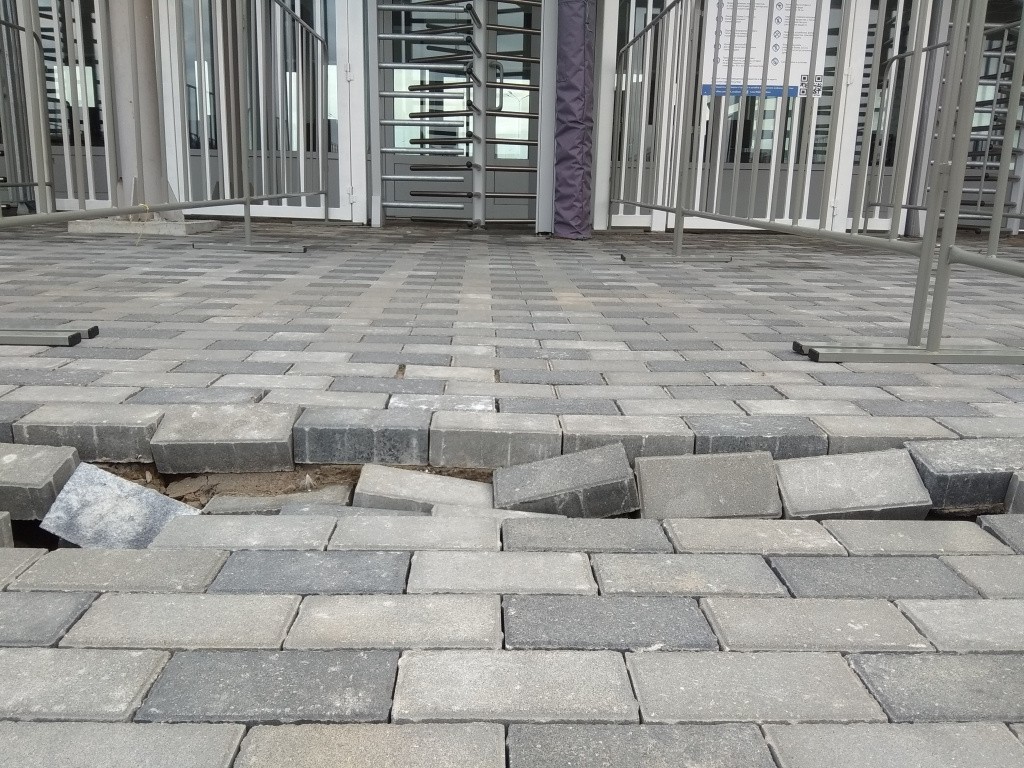 Около одного из входов на новую футбольную арену «Калининград» образовались глубокие провалы плитки. Об этом сообщает корреспондент «Нового Калининграда».