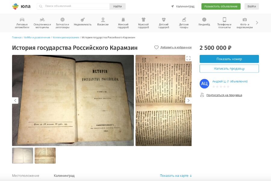Калининградец продает в интернете собрание сочинений российского историка Николая Карамзина за 2,5 млн рублей. Объявление о продаже размещено на сайте «Юла». Полное собрание сочинений было напечатано в