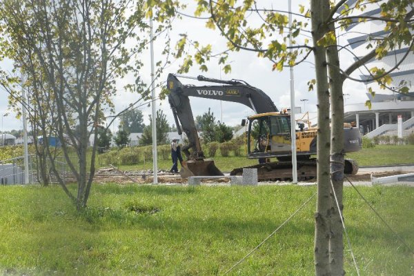 Работы проводятся примерно в ста метрах от одного из входов, где наблюдаются сильные провалы плитки. Во вторник в районе 10 утра из уже вырытой ямы мобильная установка выкачивала воду. Около 10:30 туда подъехал экскаватор и начал расширять котлован, загружая песок в кузов грузовика, который, в свою очередь, высыпал его неподалеку. Возле котлована на поддонах уложено порядка 150 квадратных метров снятой тротуарной плитки.
