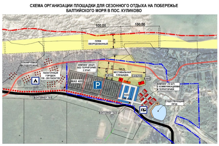 «Площадка будет оборудована парковкой с твердым покрытием с отводом и очисткой поверхностных стоков. Рядом с парковкой планируется установка санитарного блока для отдыхающих, включающего в себя душевые кабины, санитарные узлы, в том числе для маломобильных групп населения, комнаты матери и ребенка, а также комнаты для проведения утренних и вечерних процедур для любителей остановится с палатками на несколько дней», — говорится в сообщении. Часть территории будет разбита на 10 кемпингов «с полным комплексом коммуникаций» (вода, канализация, электричество); также будет зона «для более комфортного отдыха и возможностью длительного проживания», палаточный городок на 200 палаток, «зона тихого отдыха» у небольшого озера, расположенного на участке. Также намечено обустроить закусочные и кафе, «фестивальную площадь» со сценой для проведения концертов и фестивалей на открытом воздухе, зону для размещения перевозных домиков на колесах на 20 мест. Судя по схеме, на этой территории планируется сделать велодорожку.