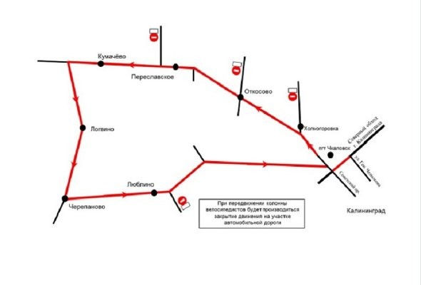 Маршрут движения велосипедистов: Калининград (Дворец спорта «Янтарный») — Волошино — Переславское — Кумачево — Логвино — Черепаново — Люблино — Калининград (Дворец спорта «Янтарный»). Закрываться дороги будут только на время движения колонны велосипедистов.
