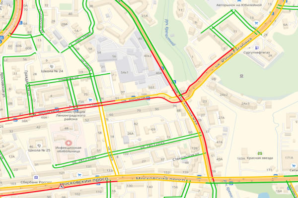 Согласно сервису «Яндекс. Пробки», пробки наблюдаются по всем направлениям. Наиболее серьезный затор на протяжении всей ул. Фрунзе. Там скорость движения не превышает 7 км/ч.