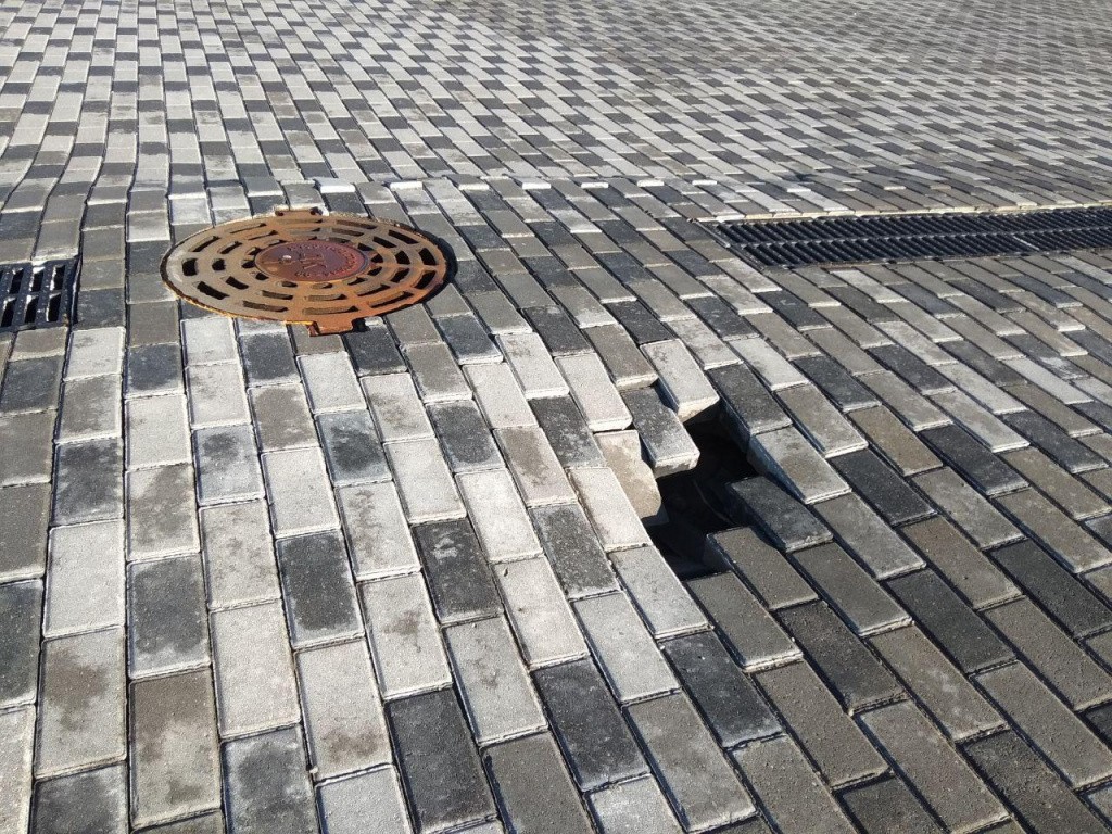 Очередной провал появился у стены одной из входных групп на территорию арены. Еще один дефект замечен в метрах двадцати от этого входа: плитка провалилась рядом с ливневой канализацией.