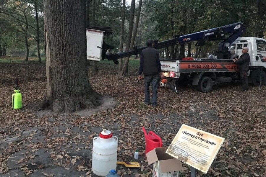 Операцию по спасению дерева приходится проводить второй год подряд. Прошлым летом у дуба начали сохнуть ветви, отслаиваться кора. Администрация округа приняла решение обследовать дерево, задача была поручена МУП «Плантеже», обслуживающему городской парк: в его штате есть дипломированный специалист-дендролог. Тогда дуб попытались вылечить впервые, и результат оказался положительным: дерево выжило. Сейчас проводятся повторная обработка, «в том числе с помощью медикаментов и специальных препаратов», говорится в сообщении.