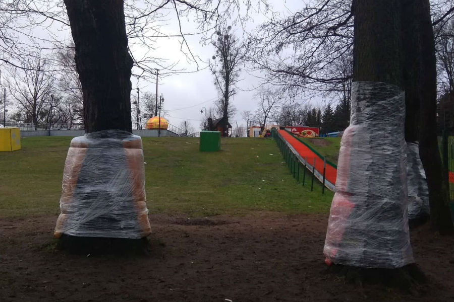 В Калининграде местные власти «обезопасили» горку в Центральном парке с помощью спортивных матов и пищевой пленки, которыми обмотали деревья. Это было сделано после того, как снег в Калининграде уже растаял.