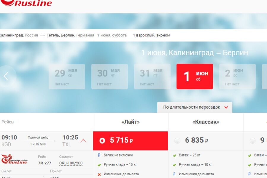 Авиакомпания «Руслайн» решила возобновить полеты из Калининграда в Берлин на предстоящее лето. На ее сайте началась продажа билетов.