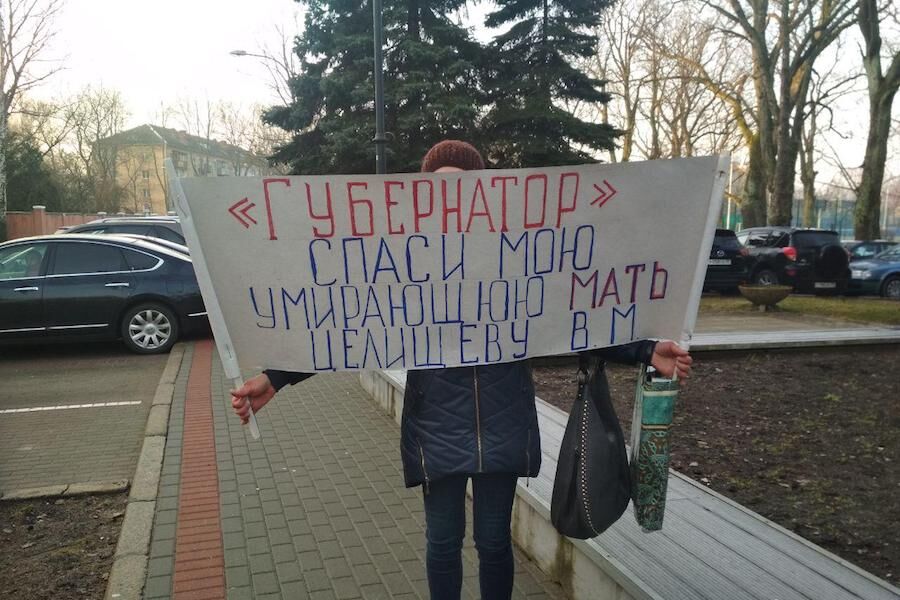Калининградка Виктория Гальцова вышла на пикет у здания областного правительства на ул. Д. Донского, 1. Как передает во вторник корреспондент «Нового Калининграда», женщина пытается помочь своей престарелой матери, её поддерживает областной Союз матерей.