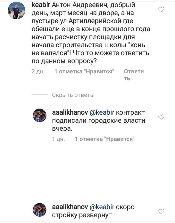 Отметим, 8 марта один из подписчиков Instagram* губернатора Антона Алиханова спросил у него, почему на месте будущей школы «конь не валялся». «Контракт подписан городскими властями вчера (7 марта — прим. „Нового Калининграда“), — ответил Алиханов. — скоро стройку развернут».