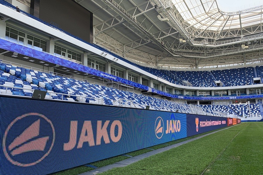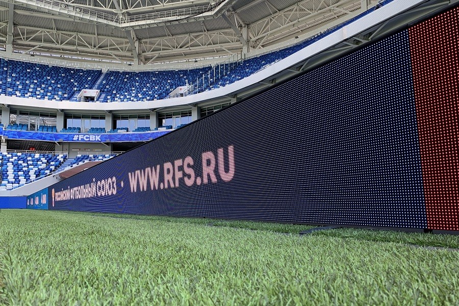 Светодиодные экраны установлены по периметру, общая длина — 240 метров, высота — 90 сантиметров. Согласно техусловиям, гарантирована видимость с расстояния до 500 метров. Экраны должны работать при температуре от минус 30 градусов до плюс 50. «Теперь по своему техническому оснащению стадион не уступает лучшим мировым аренам», — говорится на официальной странице «ВКонтакте» ФГУП «Спорт-Инжиниринг», которое являлось заказчиком стадиона и на балансе которого сооружение до сих пор находится.