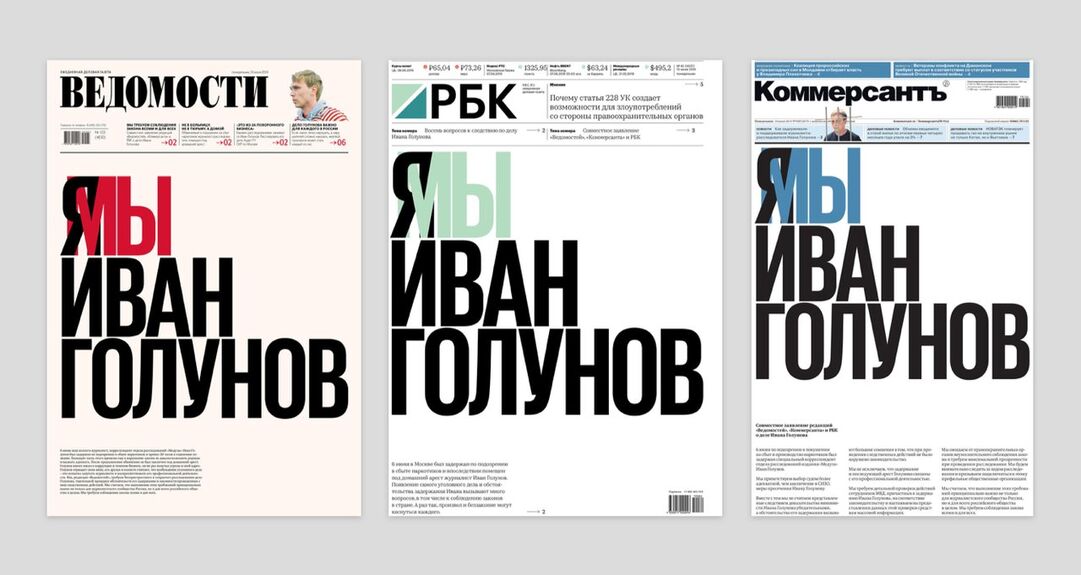 Газеты «Ведомости», «Коммерсант» и РБК в понедельник, 10 июня впервые в истории вышли с одинаковой первой полосой. Она посвящена преследованию корреспондента «Медузы»* Ивана Голунова.