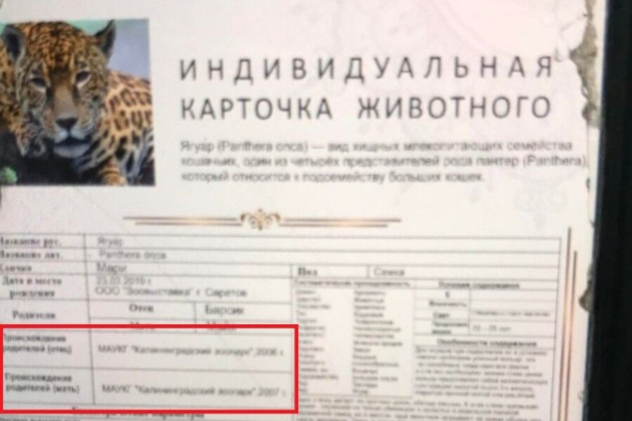 В карточке животного было указано происхождение родителей — МАУК «Калининградский зоопарк», мать — 2006 года рождения, отец — 2007. При этом, согласно официальным записям в международной информационной системе Species360 (содержит данные о животных, живущих в более чем 1000 зоопарках и аквариумах 90 стран мира), архивным документам зоопарка и свидетельствам сотрудников, последние ягуары, содержащиеся в Калининградском зоопарке, умерли в 1984 году. С тех пор этого вида в коллекции зоопарка не было.
