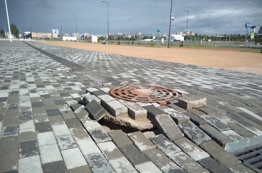 По мнению экспертов, разрушение дорог и тротуаров на острове Октябрьском в районе стадиона будет продолжаться и далее из-за просадки слабых грунтов.