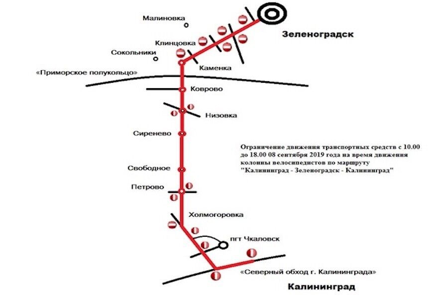 8 сентября 2019 года, в связи с проведением ХХХIV традиционного массового велопробега «Тур де Кранц» по маршруту Калининград-Зеленоградск-Калининград перекрывается часть улиц. Об этом корреспонденту «Нового Калининграда» сообщили в региональном министерстве развития инфраструктуры.