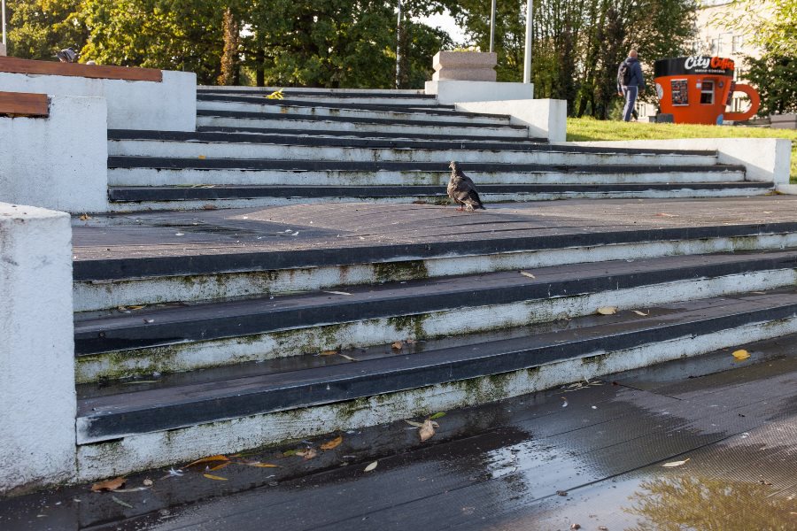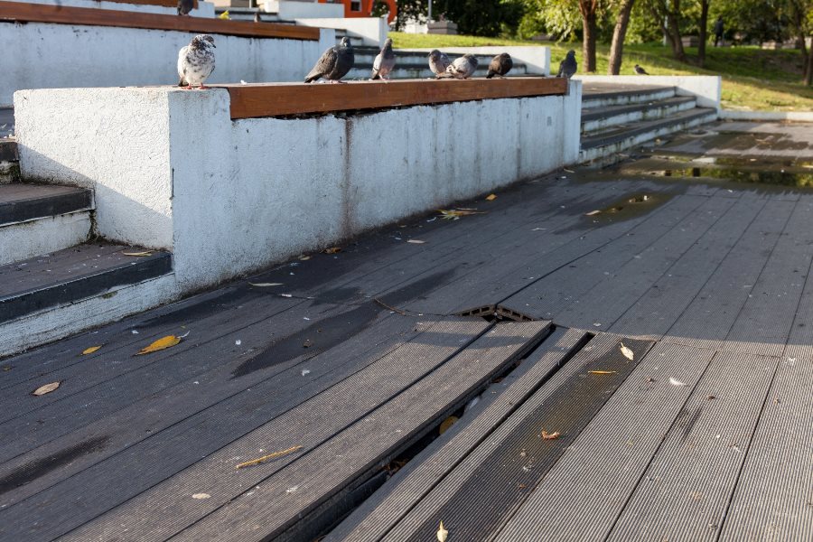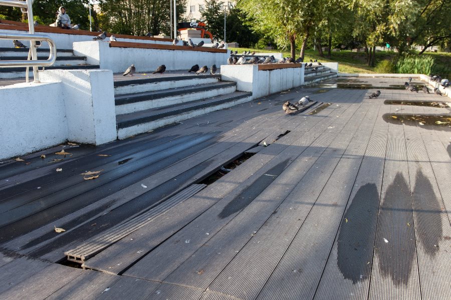 «„Благоустройство“, которое мы заслужили. На фото — терраса с пандусом на набережной Летнего озера, которую торжественно открыли в начале мая 2019 г. Работы проводились в рамках программы „Комфортная городская среда“ — части национального проекта и на них выделено 55 млн. рублей, — написал он в группе „Право на город“ в „Фейсбуке*“ . — Покрытие террасы уже сейчас расходится и лопается, местами пошло буграми, а оштукатуренные поверхности покрыты потёками и зелёной плесенью. Как-то тревожно становится за ещё незаконченное „благоустройство“ парка Южного и набережной Нижнего озера».