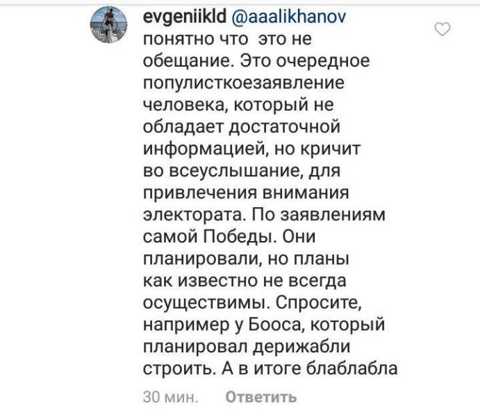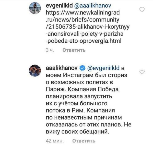«В моем Инстаграм* был сториз о возможных полетах в Париж. Компания Победа планировала запустить их с учетом большого потока в Рим. Компания по неизвестным причинам отказалась от этих планов. Не вижу своих обещаний», — написал Алиханов в ответ подписчику, который напомнил, как тот в конце 2018 года написал «Скоро из Калининграда можно будет улететь в Париж».