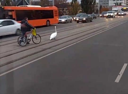 На первой эстакаде сняли велосипедиста, ведущего по трамвайным путям лебедя (видео)
