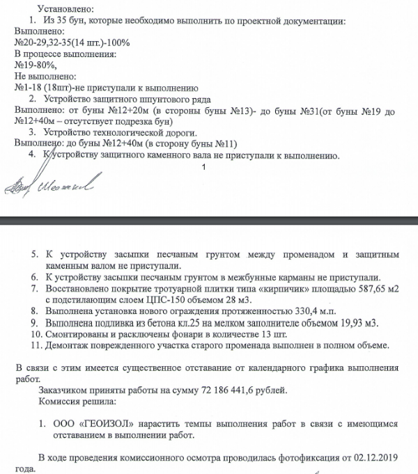 Согласно документу, общая сумма контракта составляет 229,7 млн руб, и он должен был быть исполнен 1 декабря. Однако стоимость принятых работ к тому моменту составила лишь 72,2 млн руб. — 30% от общего объема. С учетом того, что в 2019 году «Балтберегозащита» насчитала 12 штормовых дней, сроки сдачи были сдвинуты, но, несмотря на это, работы закончить не удалось.
