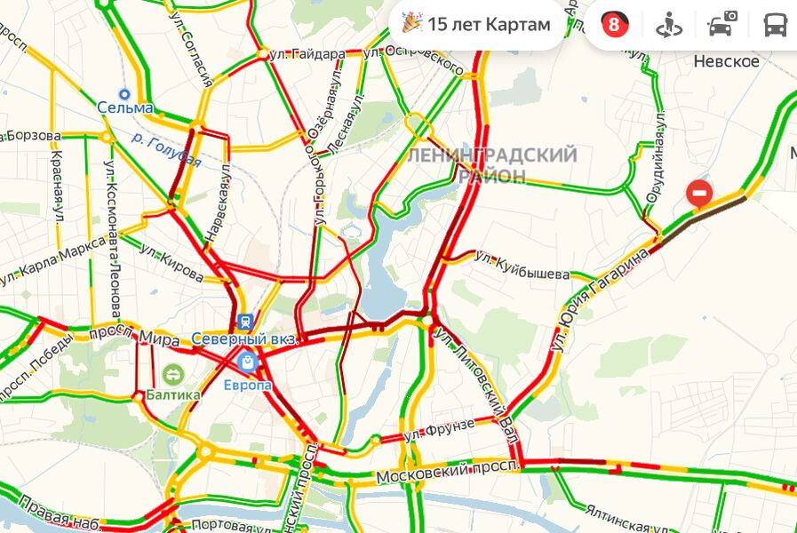 В Калининграде в понедельник, 30 декабря, на дорогах образовались серьезные заторы. Сервис «Яндекс. Карты» в районе 13:00 оценивал пробки в 8 из 10 баллов. Наиболее сложная дорожная ситуация наблюдается на ул. Невского, ул. Черняховского, ул. Горького, ул. Гайдара пр. Мира, Советском пр., а также Ленинском пр.