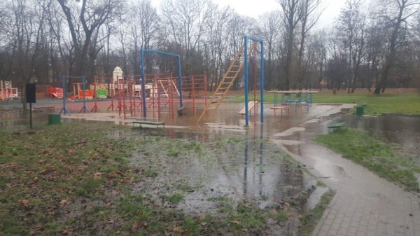 В качестве доказательства в посте опубликована фотография подтопленной детской площадки, сделанной, как утверждается, в 2018 году, до выполнения работ по благоустройству.