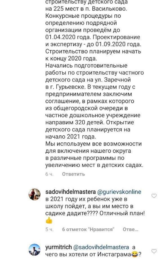 «В Гурьевске в детских садах нет мест, ребенку уже 4 года, а мы все на очереди. Город сильно заселяется, а садов новых не строят. Вы в курсе этой ситуации?» — написал пользователь, обращаясь к Алиханову.