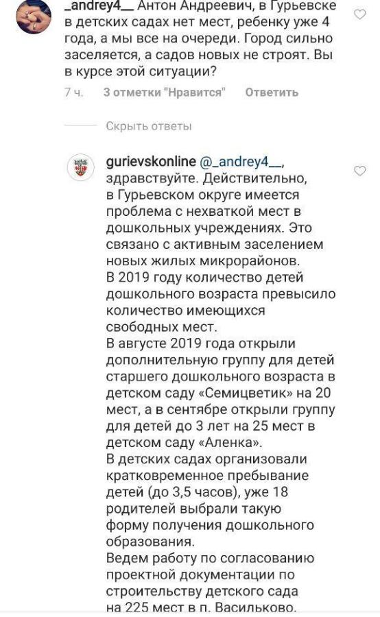 На ее вопрос отреагировали в администрации города: «Действительно, в Гурьевском округе имеется проблема с нехваткой мест в дошкольных учреждениях. Это связано с активным заселением новых жилых микрорайонов. В 2019 году количество детей дошкольного возраста превысило количество имеющихся свободных мест».