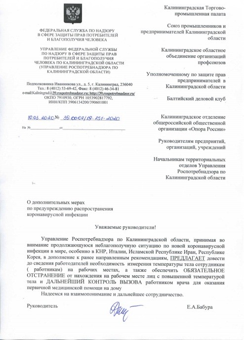 Роспотребнадзор Калининградской области рекомендует работодателям измерять температуру тела сотрудников, а также отстранять от работы тех, у кого она не в норме. Документ о мерах по предупреждению распространения коронавируса находится в распоряжении редакции «Нового Калининграда».