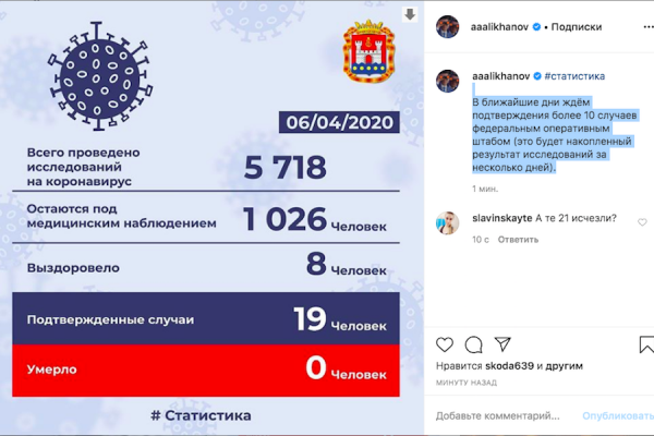 «В ближайшие дни ждём подтверждения более 10 случаев федеральным оперативным штабом (это будет накопленный результат исследований за несколько дней)», — написал Алиханов.