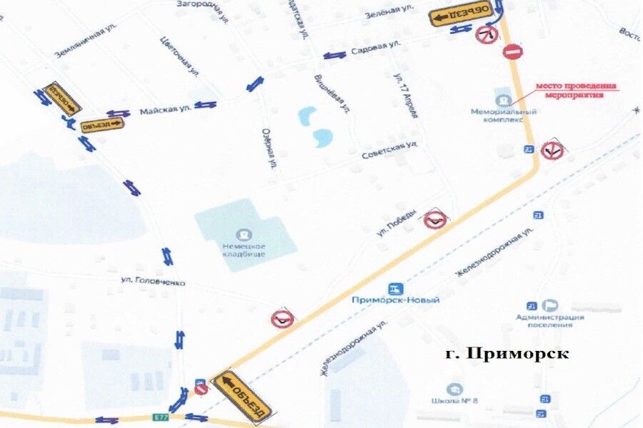 Трассу планируется перекрыть на три часа, с 9.00 до 12.00. В это время будут проводиться мероприятия по перезахоронению останков воинов Красной Армии, погибших в апреле 1945 года при взятии города, ныне носящего название Приморск.