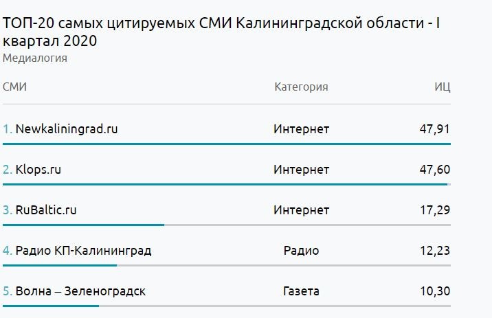 Второе место занял интернет-портал «Клопс», входящий в медиагруппу «Западная пресса», третье — портал «RuBaltic». Также в пятёрку лидеров вошли радио «Комсомольская правда — Калининград» и зеленоградская газета «Волна».
