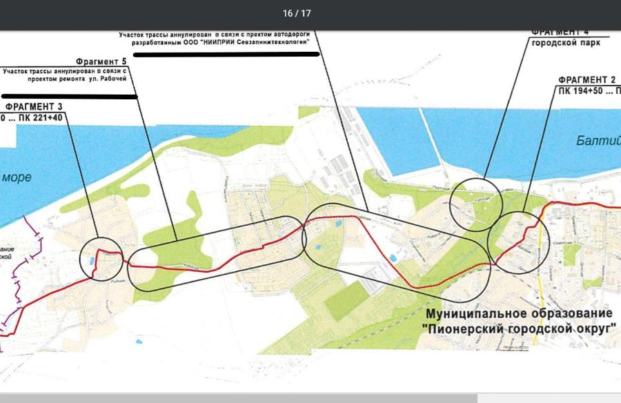 К приказу прилагаются карты, на которых отмечены территории, где нужно провести новые изыскания. На протяжении всего маршрута всего 20 таких мест. В Пионерском два участка трассы и два в Зеленоградске вовсе «аннулированы» из-за того, что там запланировали реконструкцию дорог.