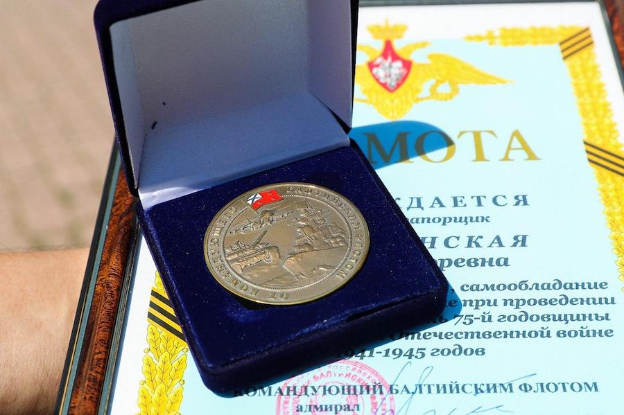 В Балтфлоте подчеркнули, что девушка не потеряла выдержки и не покинула строй, несмотря на потерю обуви. Зрители инцидента не заметили. Именно это и стало поводом для поощрения. Она получила из рук Носатова грамоту, медаль и букет цветов.