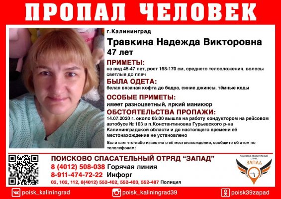 По информации организации, Травкина Надежда 14 июля около 06:00 вышла на работу кондуктором на рейсовом автобусе № 103 в п. Константиновка Гурьевского р-на. До настоящего времени её местонахождение не установлено
