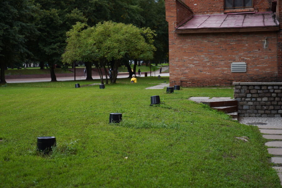 Ведра вдоль стен Кафедрального собора на острове И. Канта появились незадолго до концерта с участием Дениса Мацуева, посвященного в том числе окончанию работ по благоустройству территории.