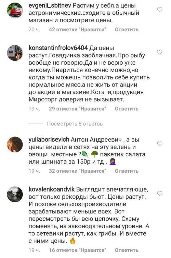 Между тем самыми популярными комментариями под публикацией губернатора стали те, в которых пользователи указали на высокие цены на сельхозпроудукцию, производимую в регионе. «Растим у себя, а цены астрономические. Сходите в обычный магазин и посмотрите цены», — говорится в комментарии, набравшем наибольшее число «лайков».
