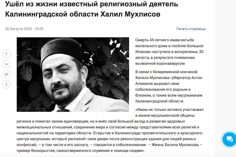 Смерть 45-летнего имама Халила Мухлисова до сих пор не попала в официальную статистику умерших пациентов с коронавирусной инфекцией. В августе этого года о смерти религиозного деятеля сообщало правительство Калининградской области.