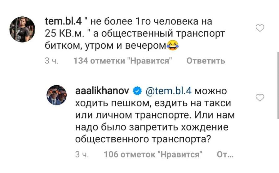 «Можно ходить пешком, ездить на такси или личном транспорте. Или нам надо было запретить хождение общественного транспорта?» — написал Алиханов.