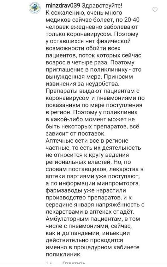 На это с аккаунта областного минздрава ответили, что сейчас очень много медиков болеет, по 20-40 человек ежедневно заболевают только коронавирусом. «Поэтому у оставшихся нет физической возможности обойти всех пациентов, поток которых сейчас возрос в четыре раза. Поэтому приглашение в поликлинику — это вынужденная мера. Приносим извинения за неудобства», — сообщили в минздраве.
