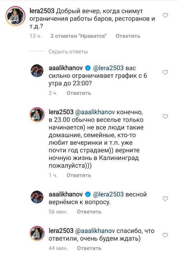 В Калининградской области в ближайший месяц не планируют разрешить ресторанам, барам и кафе снова работать по ночам. Это следует из комментария губернатора Антона Алиханова, который он оставил в Instagram*, отвечая на соответствующий вопроса пользователя.