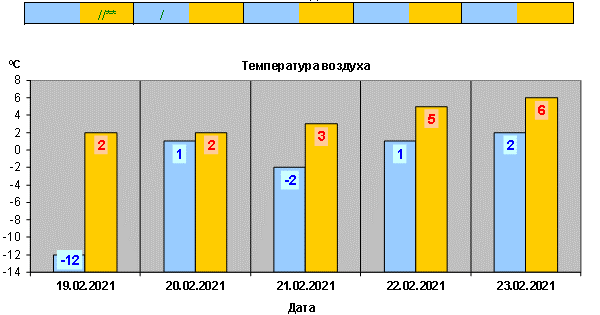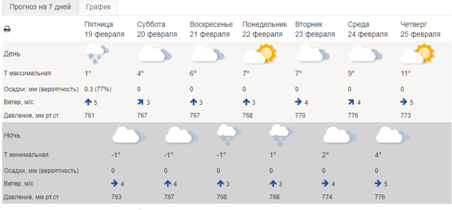 По прогнозу Гидрометцентра РФ, уже в субботу, 20 февраля, днем будет +4°, в праздничные выходные (21-23 февраля), температура будет подниматься до +6-7°. По ночам должно быть около 0°. В течение всех выходных ожидается облачная погода, но без осадков.